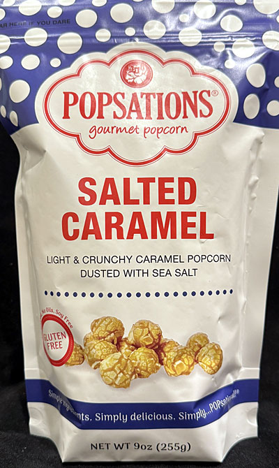 Light & Crunchy Caramel Popcorn Dusted with Sea Salt. Net Wt. 9 oz. (255g.) Stand Up Pouch. Gluten-Free. air-Popped, No Oils, Soy-Free. Ingredients: Popcorn, Brown sugar, Corn Syrup, Butter (Milk, Cream), Sea Salt, Baking soda.
