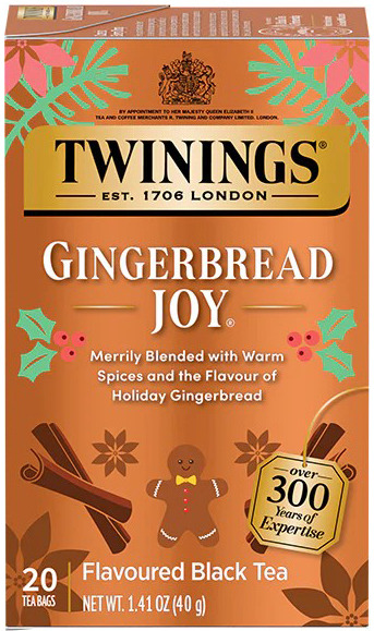 Twinings Gingerbread Joy Tea Bags contain Black Tea Merrily Blended with Warm Spices and the Flavor of Holiday Gingerbread. Ingredients: Black tea, Ginger, Ginger flavor and other Natural flavors. 20 count Tea Bags. Net Wt. 1.141 oz. (40g.) Contains Caffeine.